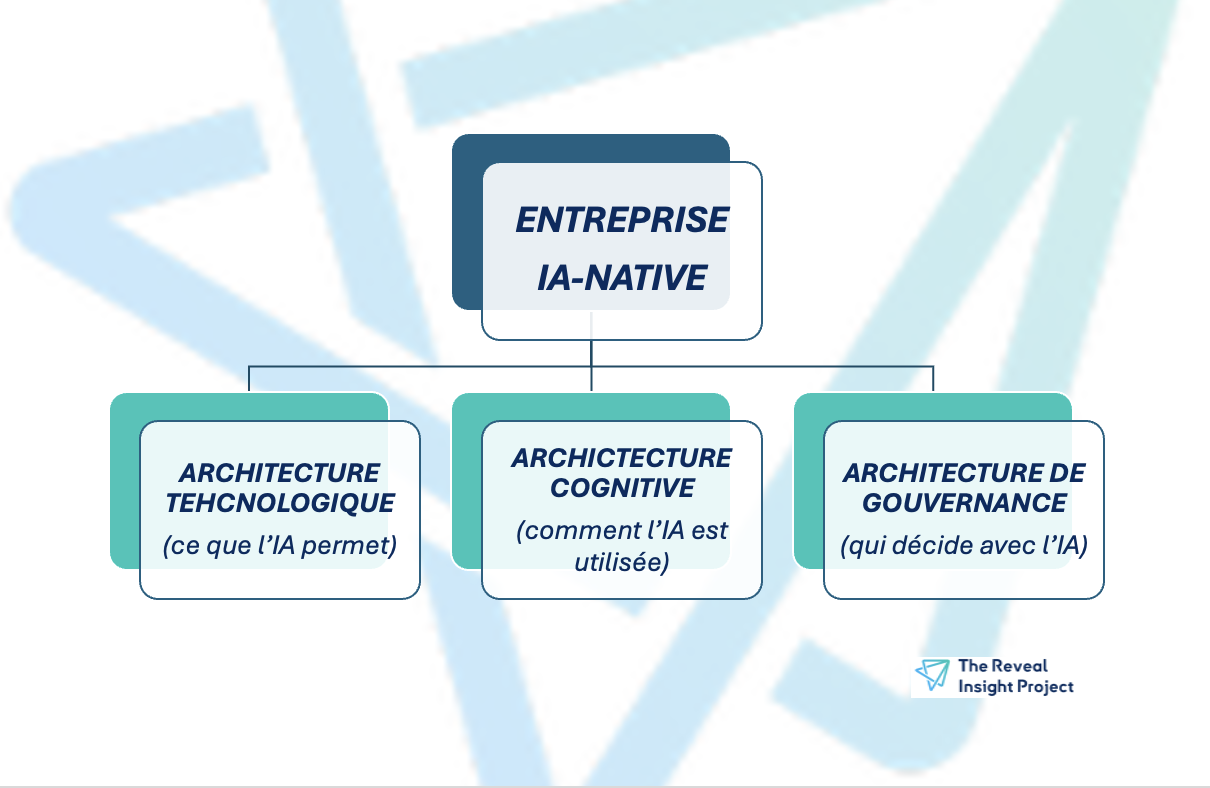 À partir de ce stack, nous proposons un cadre d’analyse simple : l’entreprise IA-native repose sur trois architectures complémentaires.
